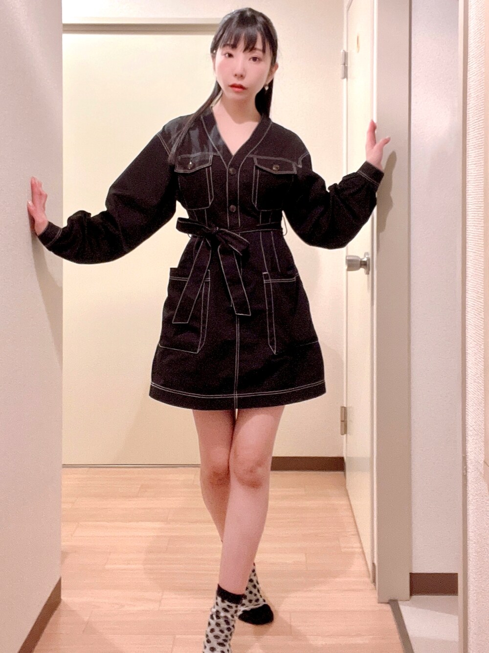 相沢梨紗のワンピース「FRONT BUTTON PUFF SLEEVE S/OP フロントボタン パフスリーブ ショート ワンピース」を使ったコーディネート