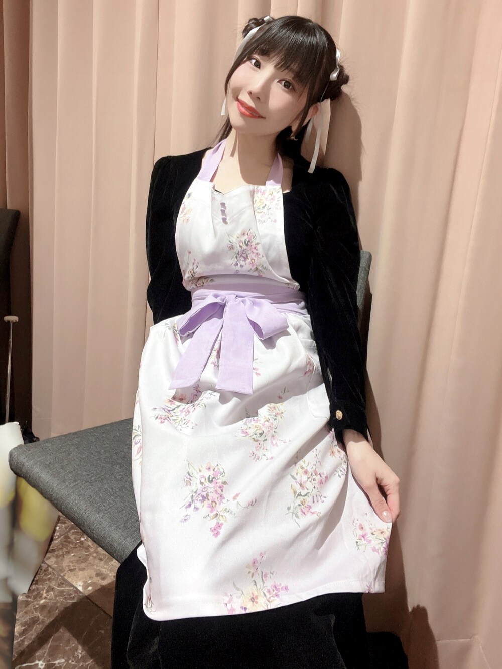 ブラックのロングワンピースにガーリーなエプロン🤍