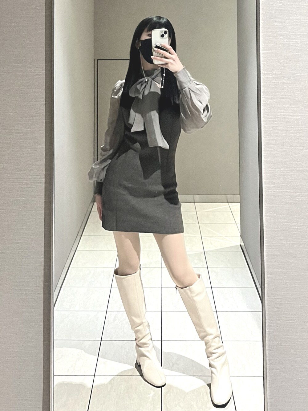 白のロングブーツ初めて買ったけど、ライン綺麗でいい感じ🤍 このワンピースもこの冬活躍中🤍 リボンの結び目を、前後に変えるだけでも印象が変わる⭕️
