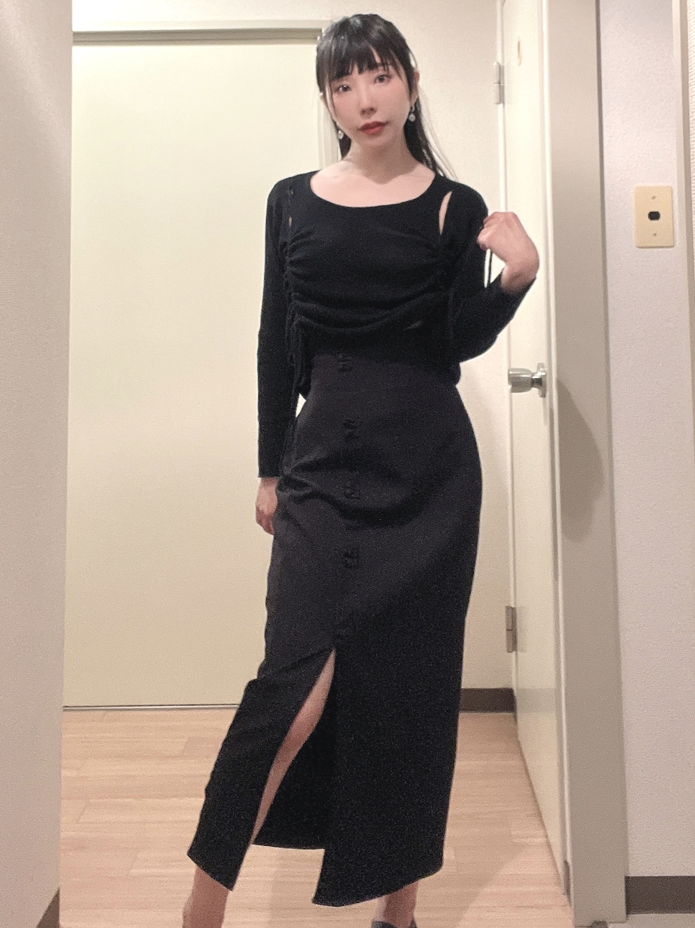 相沢梨紗のニット/セーター「カットアウトシャーリングリボンリブニットトップス」を使ったコーディネート