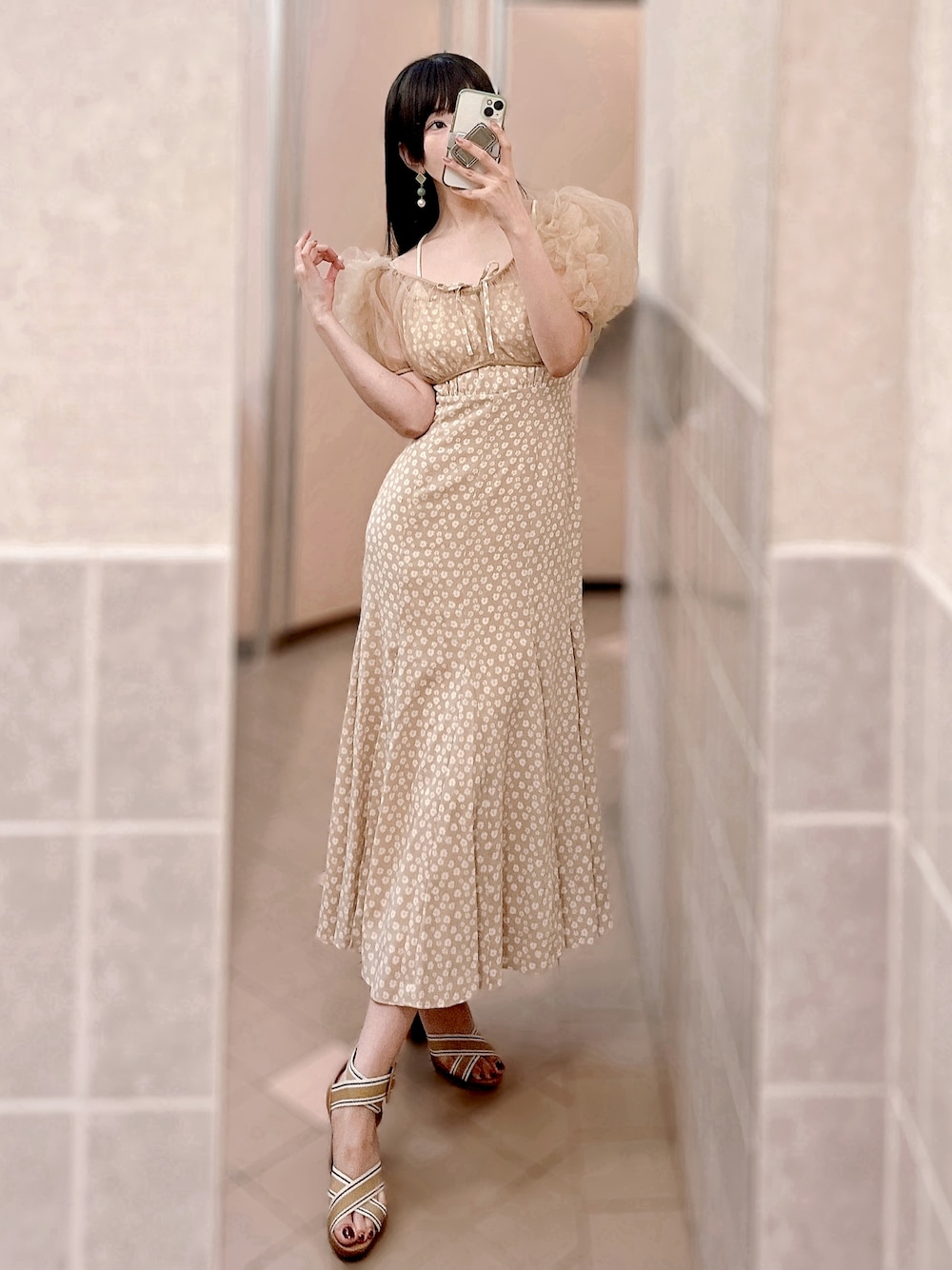 配信の時のワンピース💖 チュールのトップスは着回しできて⭕️ ニットとか羽織ったら秋も着れる色合いなので楽しみ😊