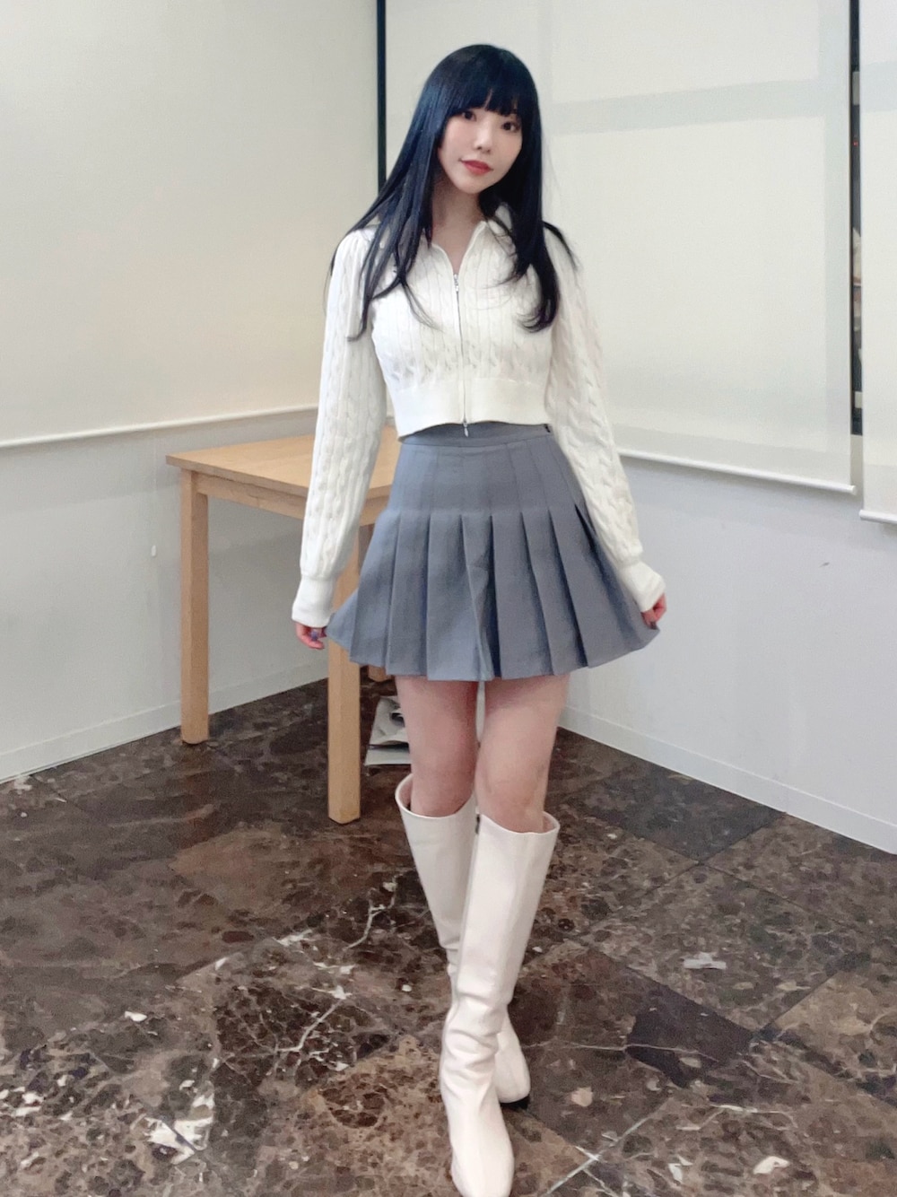 🩶🤍 このプリーツスカートいろんなトップスに合うので買ってよかった〜となってます☺️ ミニスカには、、ロングブーツ。 ブーツがあったかくて欠かせぬ❗️