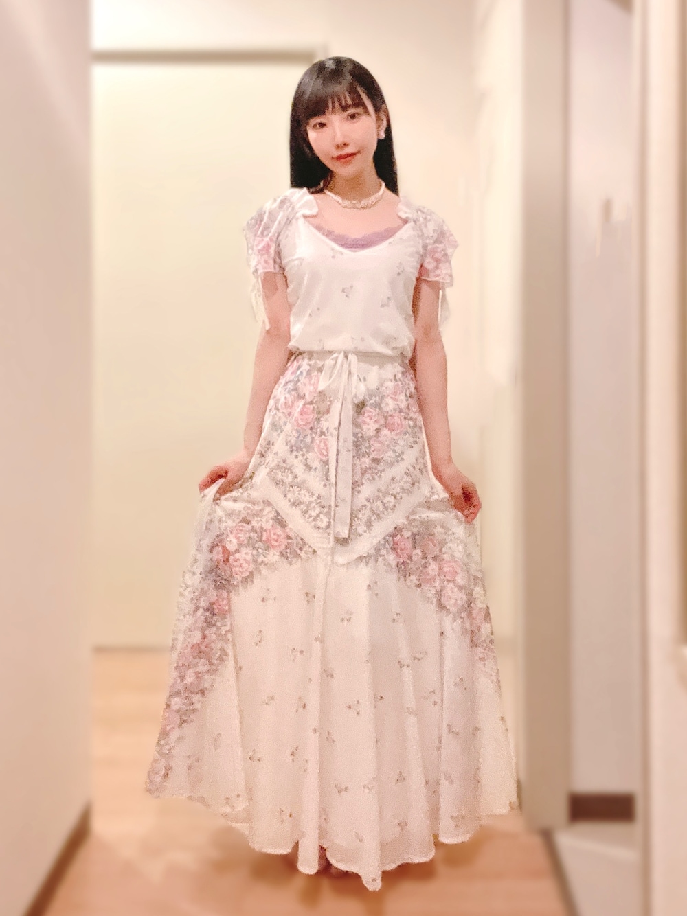 Grimoireのヴィンテージワンピースとネックレス🤍 昔のプラスチックの雰囲気なのかな? 少しマットな艶のネックレスがお気に入り! 春色でカワイイ〜 柄もかわいい〜