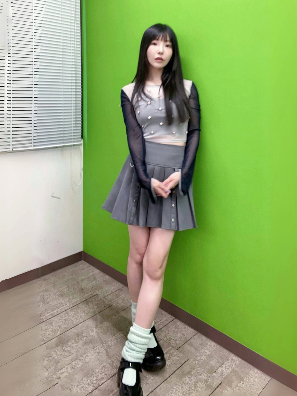 ハイウェストのスカートを短めのトップスに合わせたよ🤍 ネイビーとグレー🩶💙合わせるの好き✨