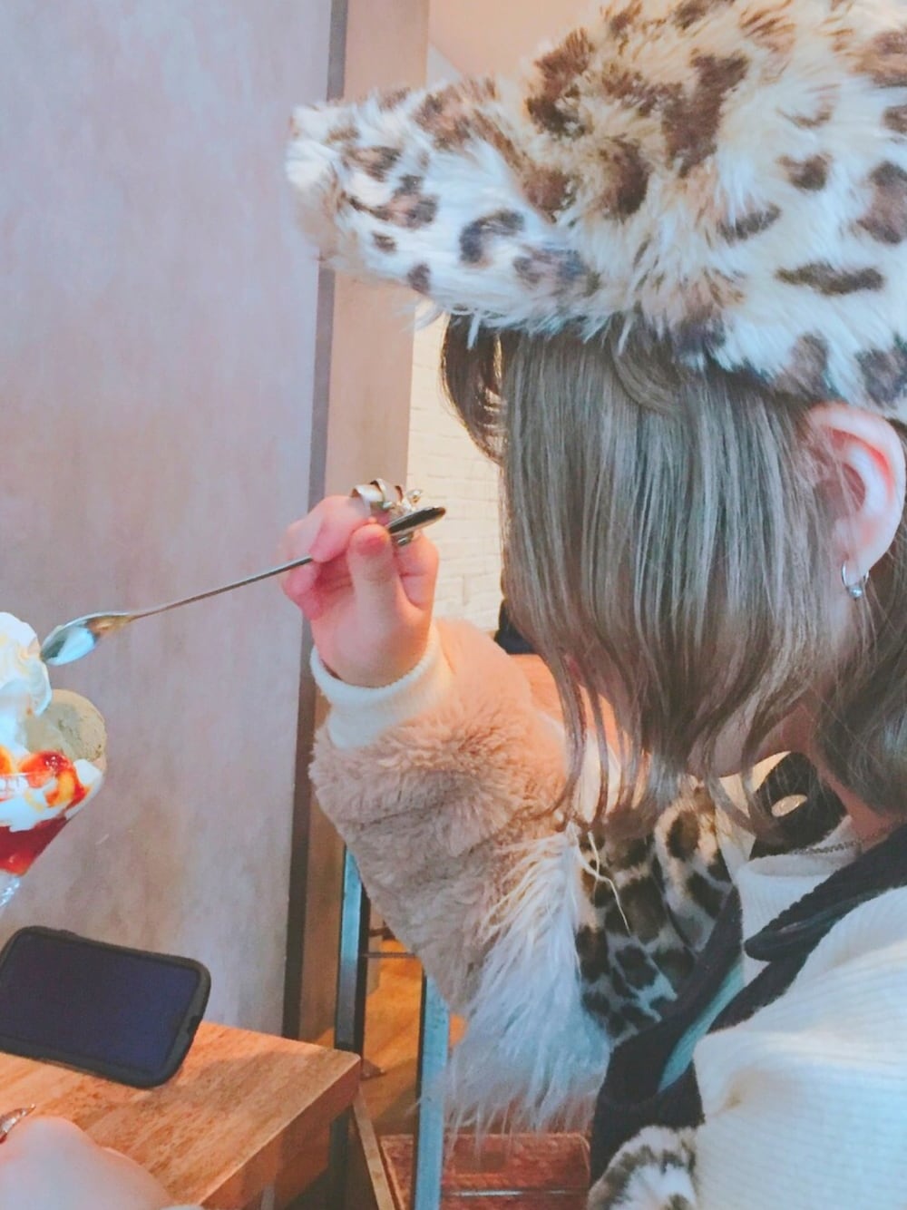 2000えんのパフェを食べる画像です もはや冬コーデ