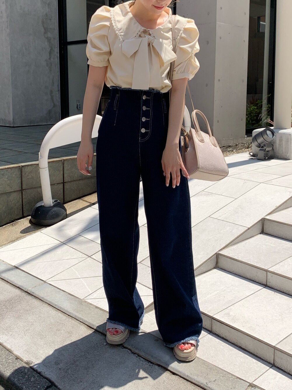あまめブラウス×デニムの甘辛mixコーデ♡ ボウタイは取り外せます👌🏻👌🏻