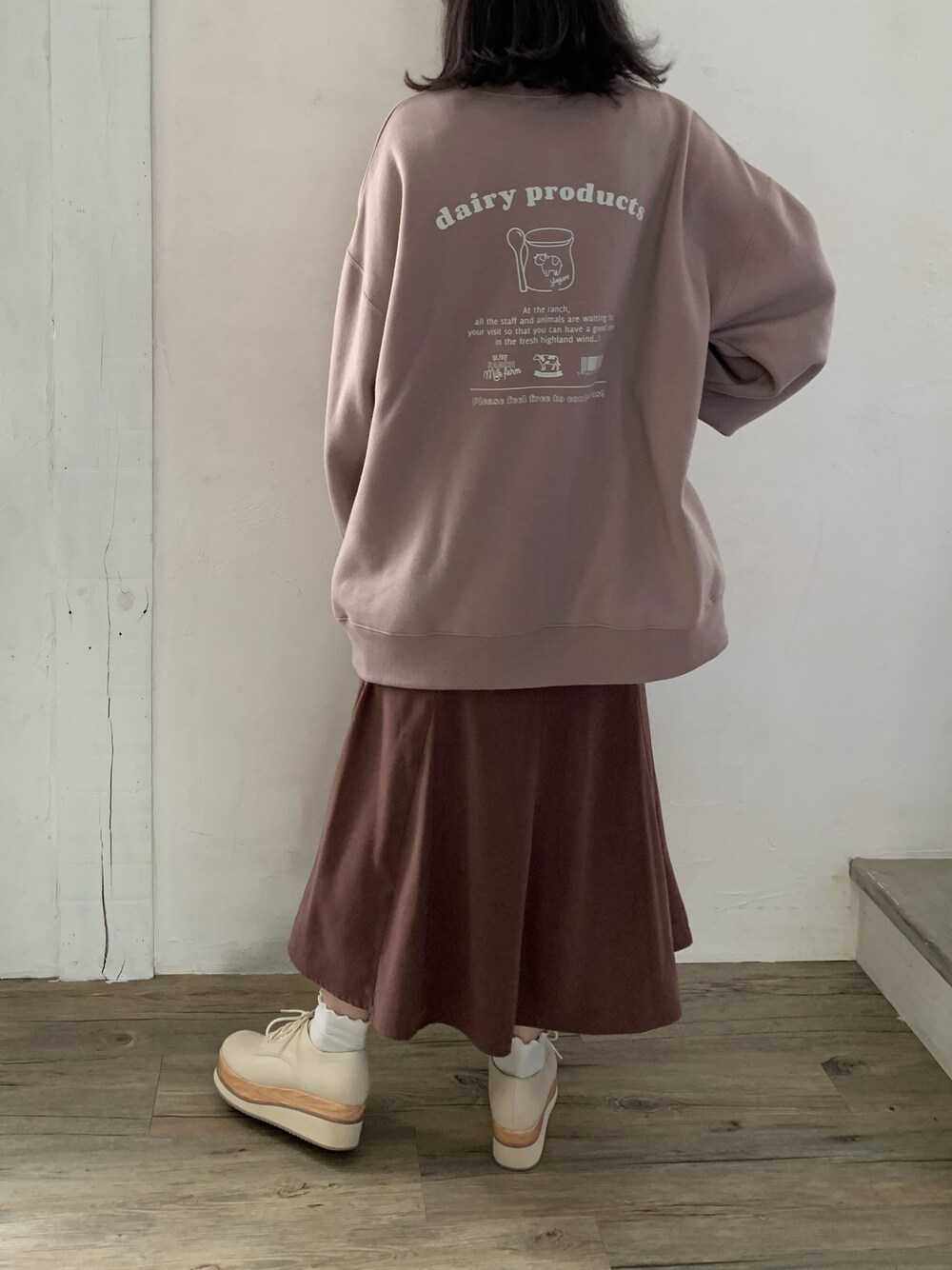 ヨーグルトのデザインがかわいい ゆったりとしたスウェットコーデ♡ スカートはトレンドのマーメイドスカート合わせで着てみました♡ ブラウンで秋感アップ!