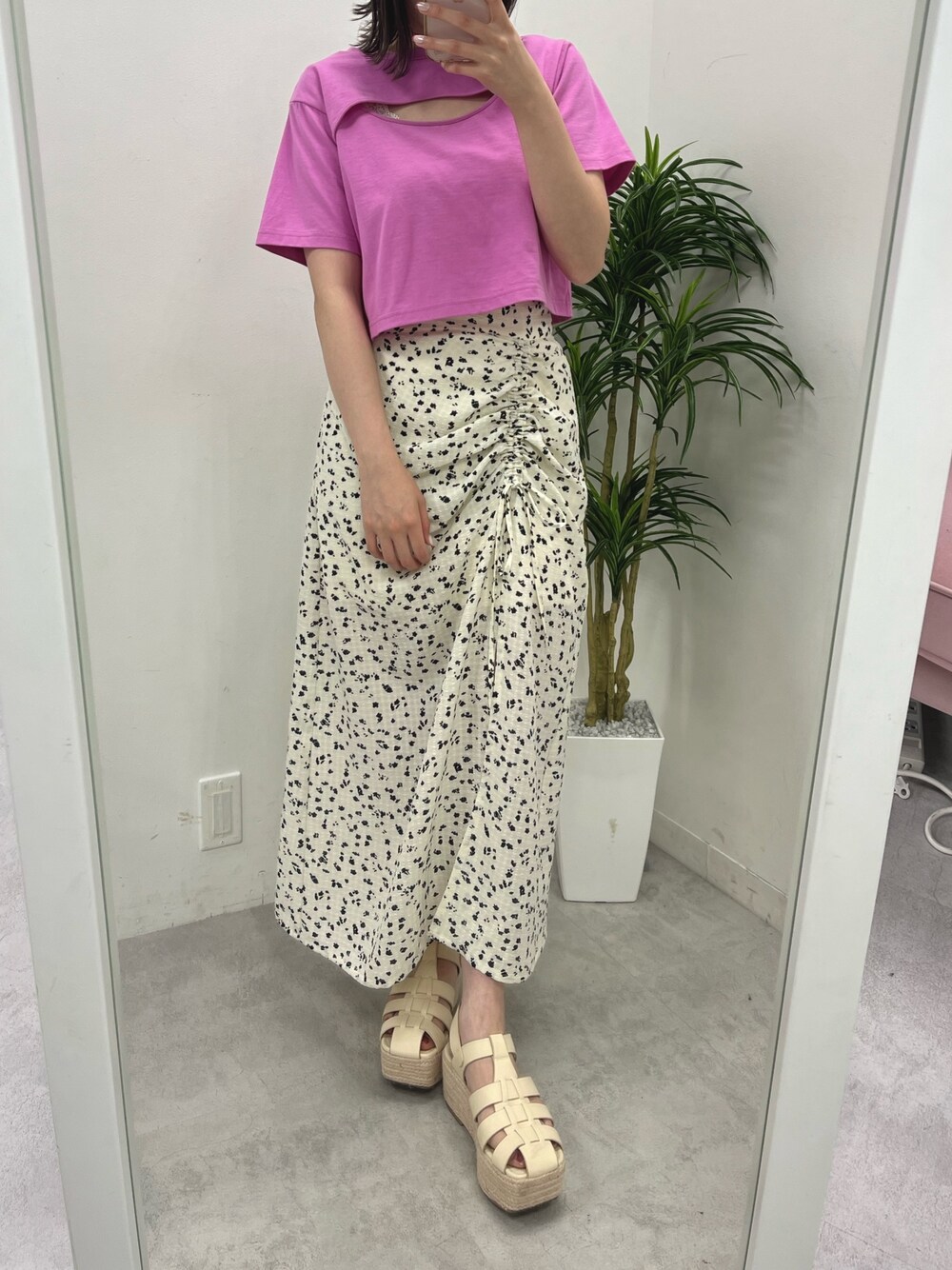 トップス→フリーサイズ クロップド丈の春夏に ぴったりなカラーTシャツ♡ なんと背中がチラりと 肌見せになっているんです◎ ダブルフロントなので胸あきでも◎ スカート→フリーサイズ 今季トレンドのスリット入りスカート ドロストデザインが大人可愛い♡ スリットは深すぎないので露出は控えめ
