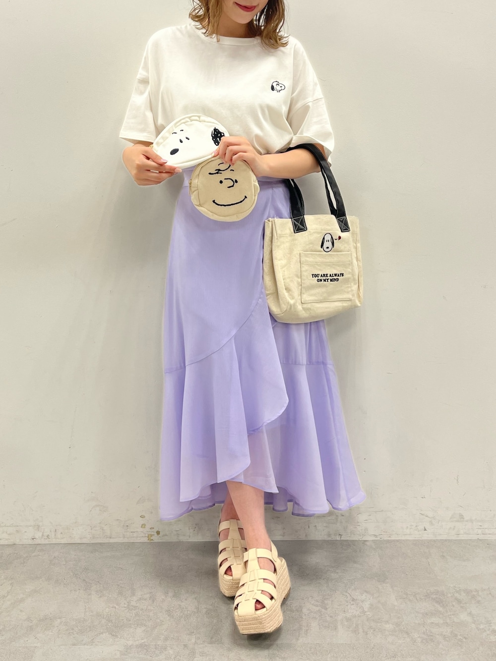 PEANUTScollaborationアイテム♡ Tシャツ→フリーサイズ 胸元のコロンとした刺繍がとっっても可愛い 後ろにはスヌーピーがプリントされた オリーブオリジナルのTシャツ◎ ミニトート ポケットからチラッとスヌーピーが 顔を出す可愛いデザイン♡ おでかけに丁度いいサイズのトート◎ ポーチ スヌーピーとチャーリーブラウンの キュートなポーチ しっかり開くので物の出し入れもしやすい◎