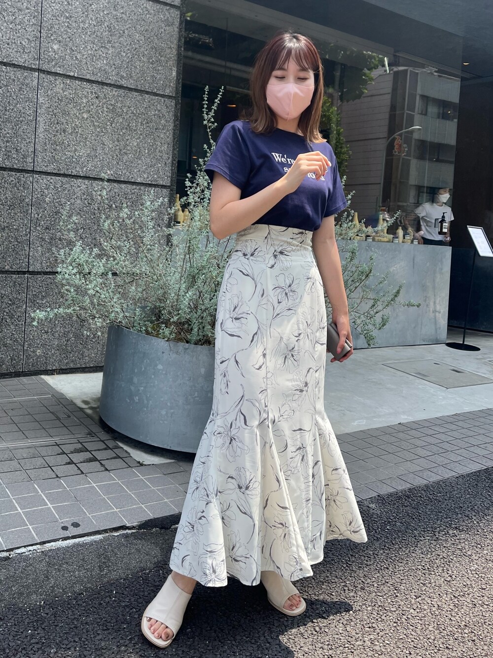 トップス→フリーサイズ ぷっくり刺繍がポイントなTシャツ スッキリとしたサイズ感でインしやすい◎ 二の腕の真ん中くらいの袖丈で 気になる部分もカバーできる◎ スカート→フリーサイズ WEB限定のフレアスカート ウエスト周りは細見えなスッキリシルエット♡ 後ろがゴムで着脱もしやすい