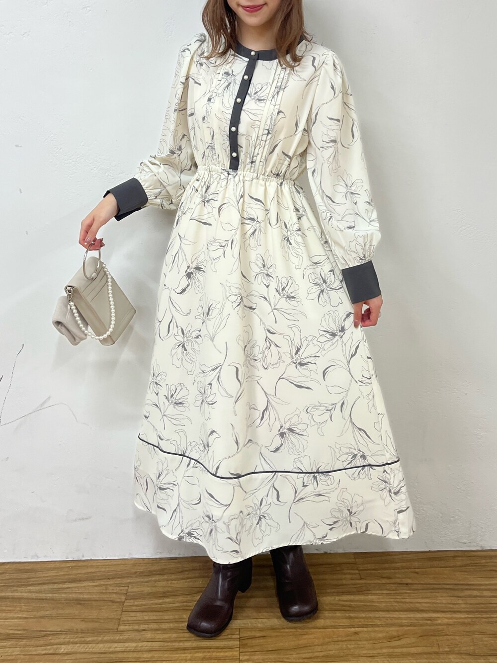 ワンピース→フリーサイズ 配色のデザインとパールボタンが可愛いピンタックワンピース。 ウエストは総ゴムなので、楽に着ることが出来ます◎