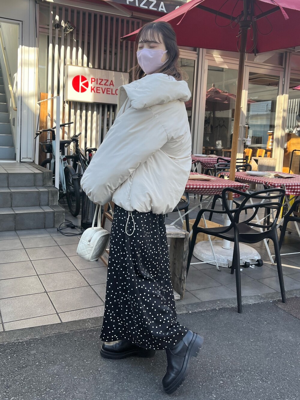 ボレロ×キャミワンピ キャミワンピースはアジャスターで長さ調整可能! デコルテがあいてることで、骨格ストレートさんもスッキリ着ることができます◎ アウター→フリーサイズ 毎年オリーブで人気の中綿ブルゾン♡ 今年のブルゾンは首元もボリュームがあるので、閉めるとマフラーいらずのアウターに◎ お袖のたっぷりボリュームも可愛いポイント! 裾は絞ることができるのでスッキリ着られる