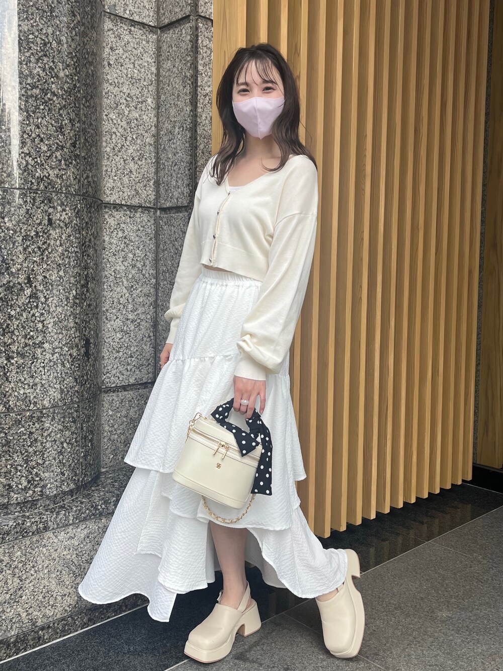 ・ハートカーディガン→フリーサイズ ハートボタンが可愛いカーディガン。 クロップド丈なのでロングボトムにもミニボトムにも合わせやすい〇デコルテの開くVネックデザインなので骨格ストレートも華奢みえしちゃいます。 ・ティアードスカート→フリーサイズ 裾にかけてボリューム感のあるティアードデザイン ロングスカートだけどチラッと肌見えが今っぽ〇 ウエストはゴムなので履きやすい〇 155cmでくるぶしくらいの丈感です