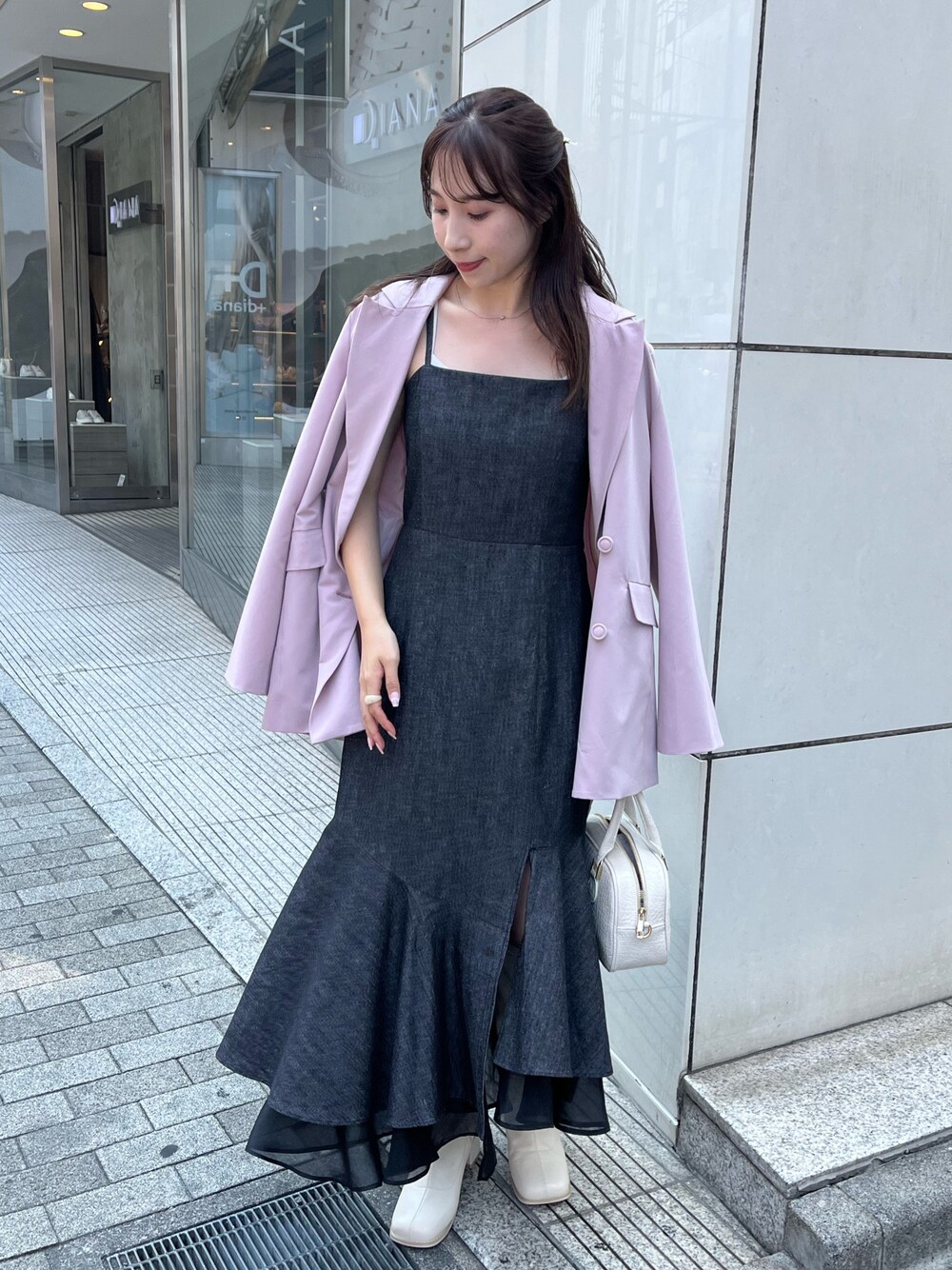 ワンピース→フリーサイズ 裾シフォンの揺れ感が可愛いロングワンピース ウエスト切替の位置が高めなので足長効果も〇 アジャスターがついてるので丈感の調整も可能です 低身長さんでも着やすい〇 ジャケット→フリーサイズ ゆったり着れるシルエットでおしり周りまでカバーできます〇 取り外し可能な肩パットがついてます。