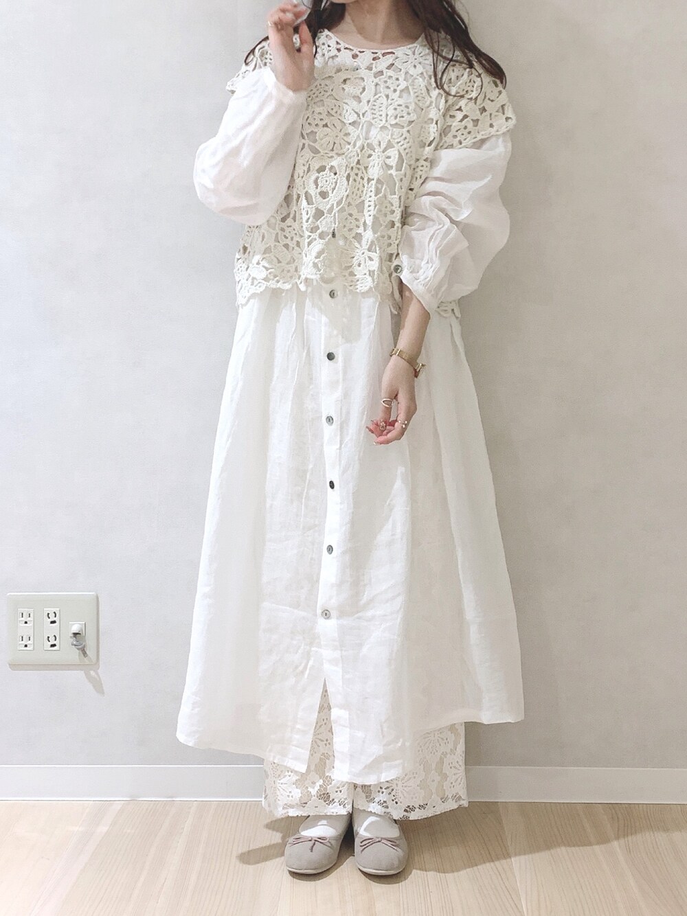 ワンピースとベストの スタイリングがかわいい𓂃 𓈒♡ 白のワントーンコーデ☁