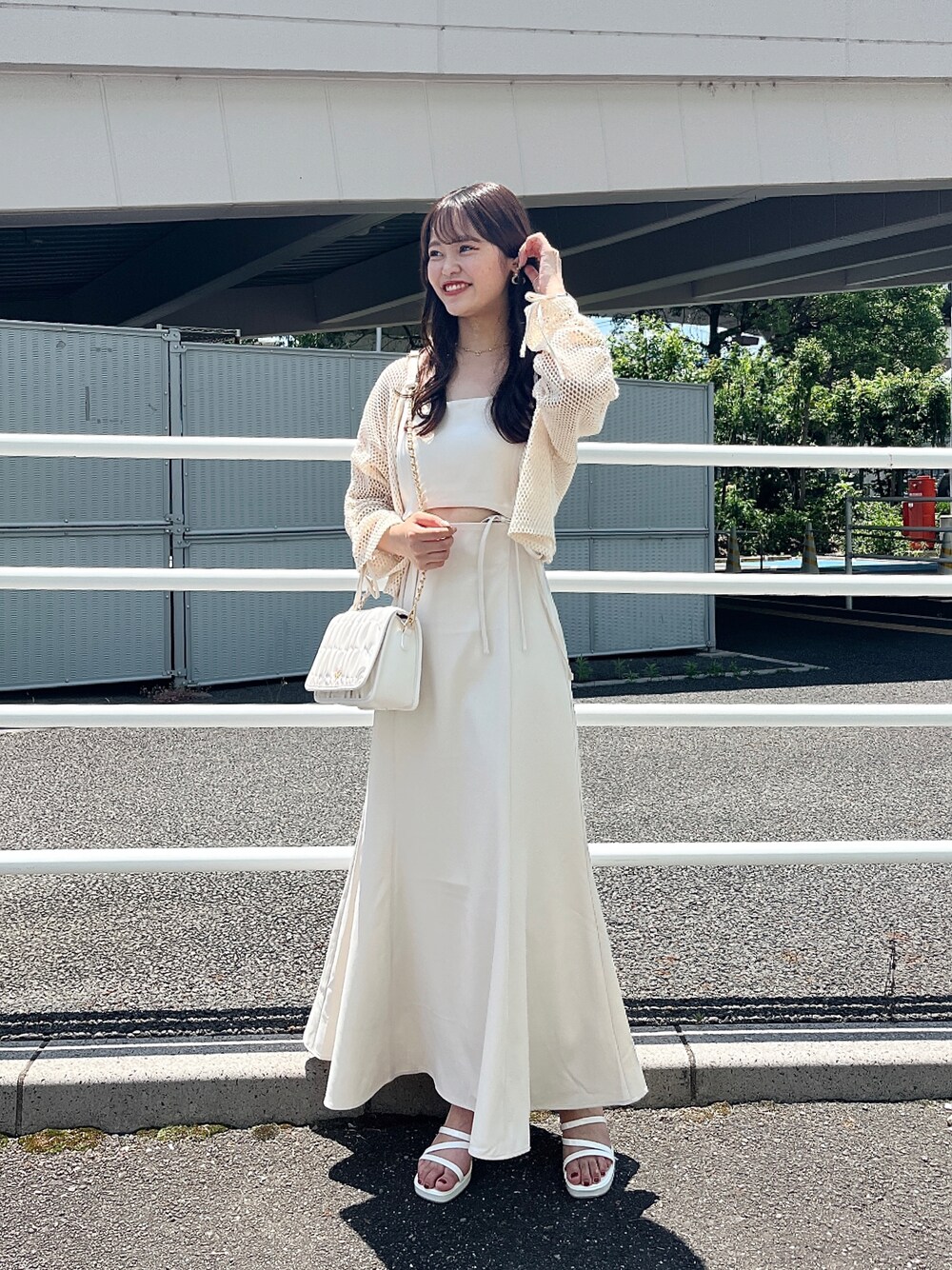 着用コーデ:20件大人かわいい淡色コーデ୨୧ 【ワンピース】 肌見せが大人かわいいワンピース♡ リボンをほどくと ビスチェにもなるので着回し抜群! シルエットがすごく綺麗で 細見えするデザインになってます◎ 【トップス】 夏っぽいメッシュカーデ♡ 程よく肌見せしたい方にピッタリのアイテム! 短めの丈感なのでスタイルアップ効果バッチリ◎ 前のリボンを閉じてトップスとしても着れるので 合わせるお洋服によって雰囲気変えられます!