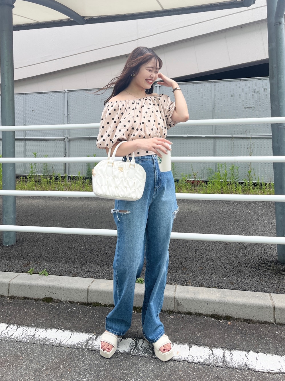 大人かわいいデニムコーデ♡ 【トップス】 オフショルでも着れるあざとかわいいブラウス♡ お袖のふわっと感がかわいらしく、 二の腕カバーもバッチリのシルエットです◎ 短めの丈感なので、パンツ合わせだと アウトしても綺麗に着れます! 同素材のスカート(0131010380)と合わせて セットアップで着るのもオススメ♡ 【ボトム】 去年からトレンドなカッティングデニム! 少しの肌見せがかわいくて人気のデザイン♡ 全体的にゆるっとしているので 締め付け感なく楽に履いて頂けます◎ 後ろがゴムになっているのも嬉しいポイント!