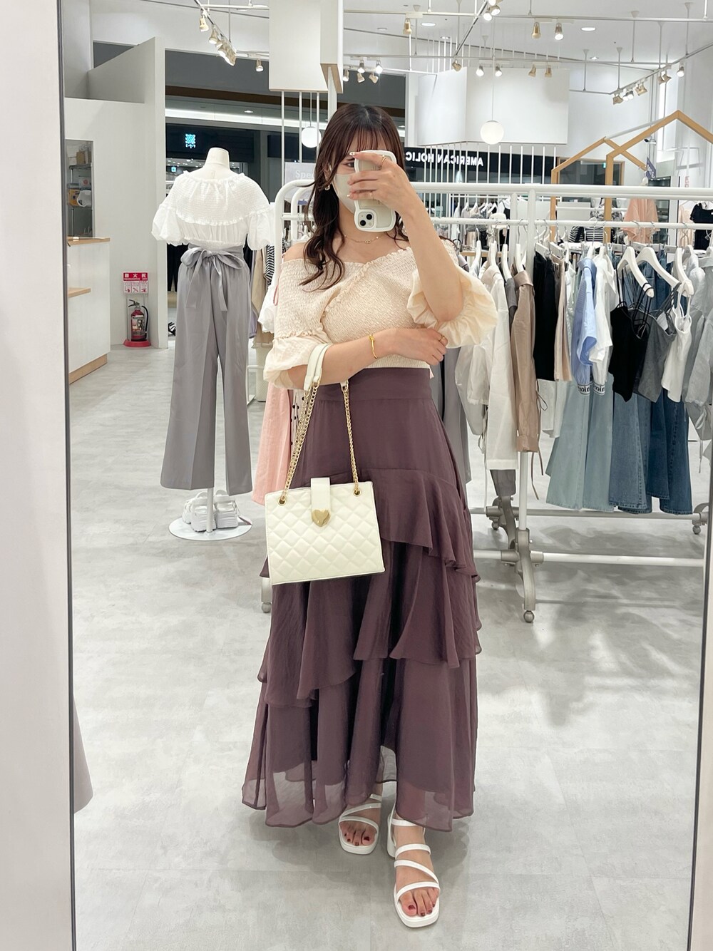 大人かわいい淡色コーデ♡ 【トップス】 オフショルでも着れるブラウス! 程よく肌見せできて大人かわいいコーデに ぴったりの1枚です♡ パフスリーブになってるので、 二の腕カバーもバッチリです! 【ボトム】 ティアードが大人かわいいロングスカート! 合わせ方次第でキレイめにもガーリーにも◎ ふわっと揺れるシルエットは 女性らしい印象にしてくれます♡