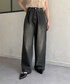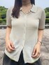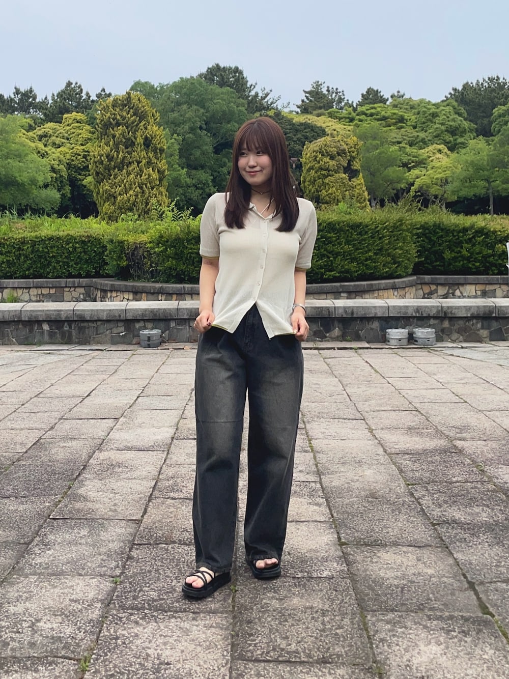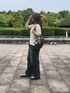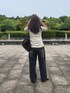 襟と裾のグリーン配色が可愛いニット! デニムと合わせてカジュアルに✨️ シアー感のあるさらっとしたニットなので夏でも涼しく着られます🪽 丈はおしりが少し隠れるくらいの長めです! パンツはMサイズで足の甲が隠れます◎ フックがウエストマークしてくれます🤍