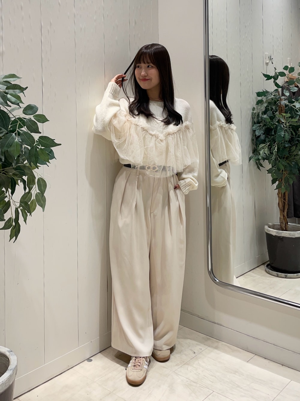 トップス : Fサイズ着用 パンツ : Mサイズ着用 柔らかい生地感のもちもちニット🐏 チクチク感はなく、少し透け感があります! ボリュームたっぷりのチュールが可愛いです🫶🏻 パンツは162cm.Mサイズで足の甲にかかるくらいの丈感です! とろみと適度な落ち感が足のラインを拾わない神パンツ✨️ ----------------- 【スタッフ情報】 @risapyon_pal 身長 : 162cm 骨格 : ウェーブ 足のサイズ : 23.5~24cm