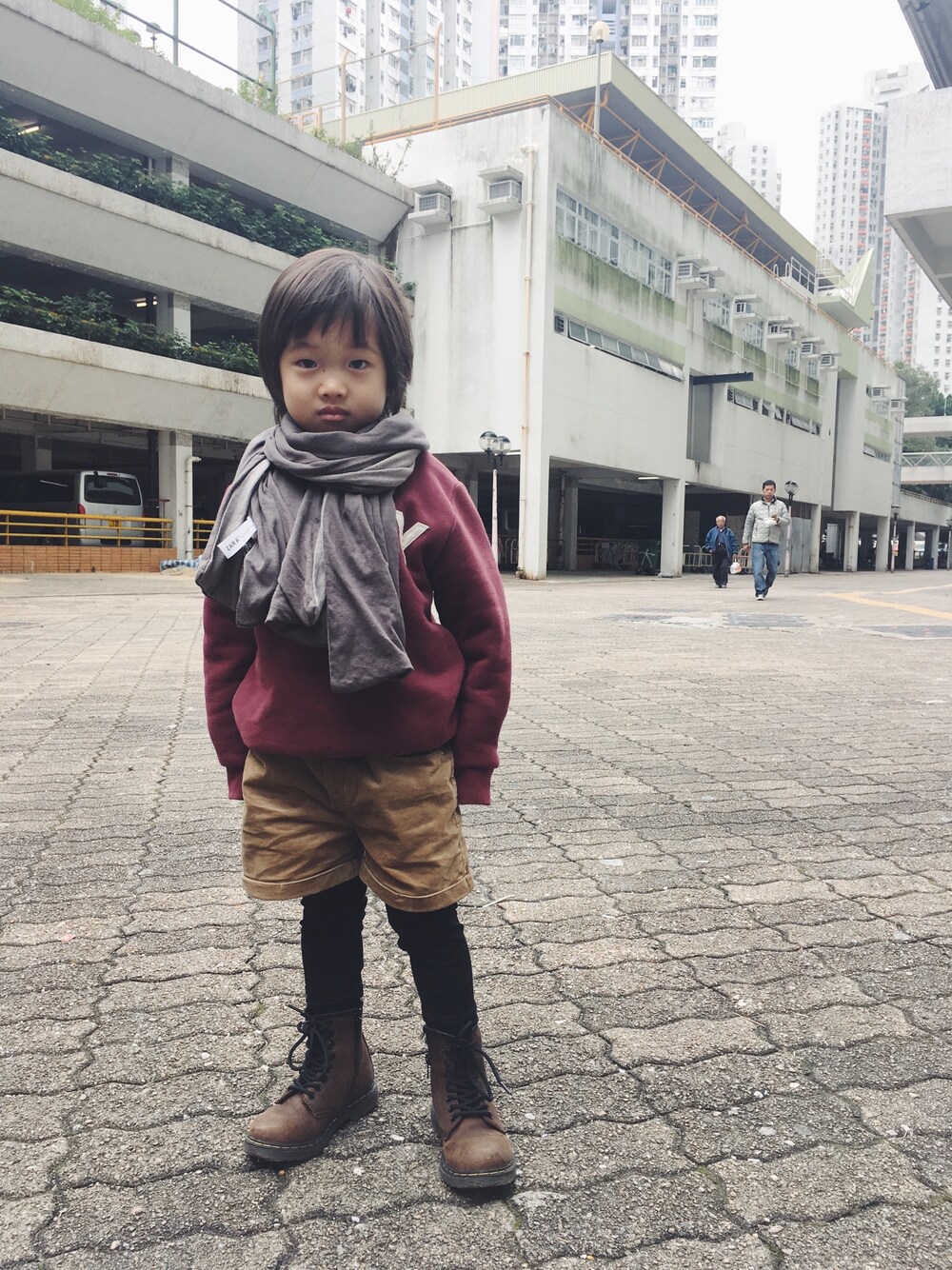 ブラウン系のカーゴパンツ、グレー系のマフラーを着用したキッズの冬コーディネートの1枚目の写真