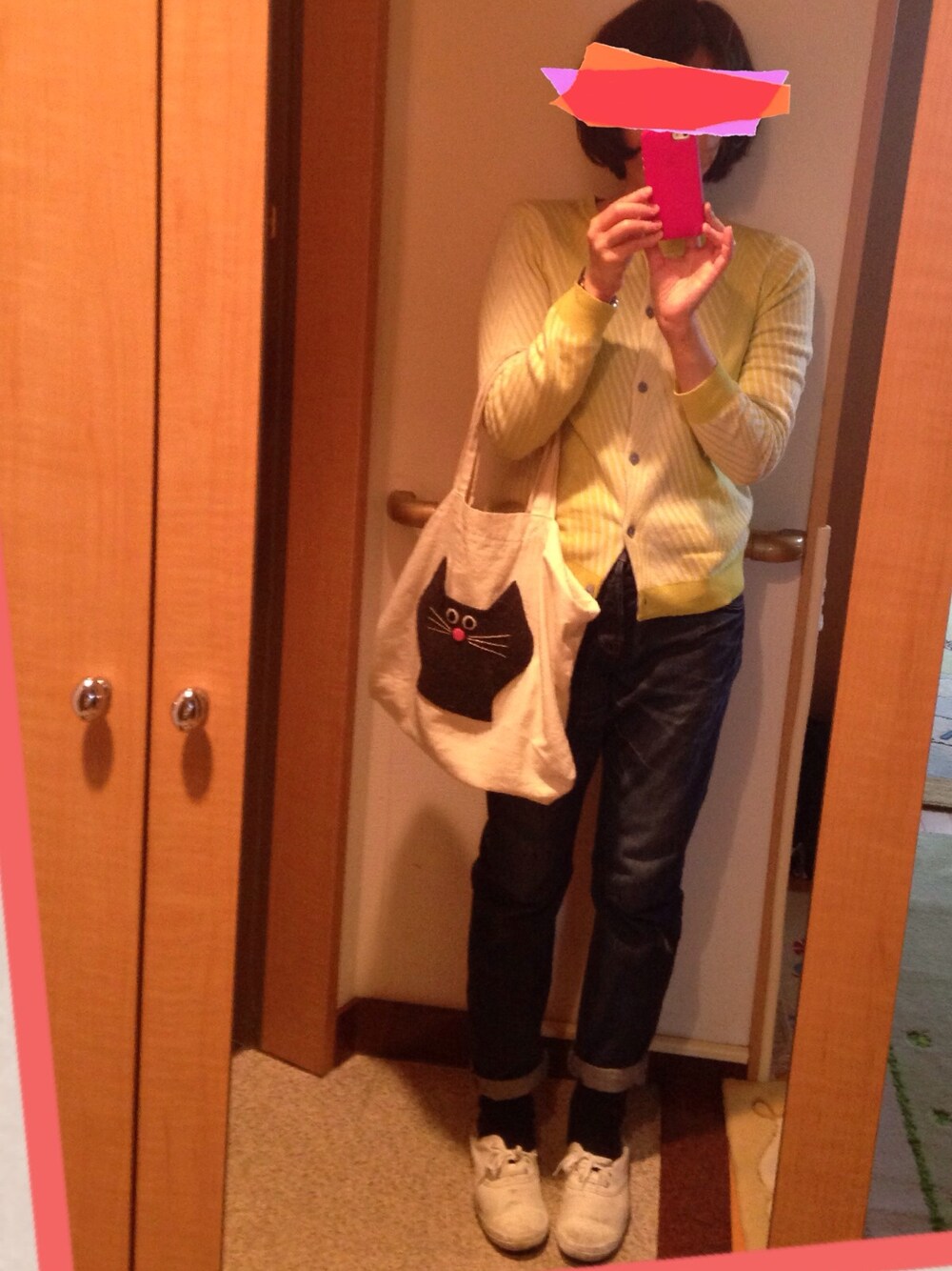 カーディガン:フェリシモ デニム:ドミンゴ カバン:手作り 靴:無印