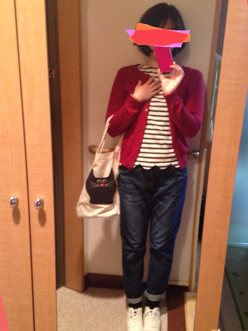 カーディガン:ユナイテッドアローズ ボーダー:ドットアンドストライプ デニム:ドミンゴ 靴:無印 かばん:手作り 赤いカーディガン…安易ですが…