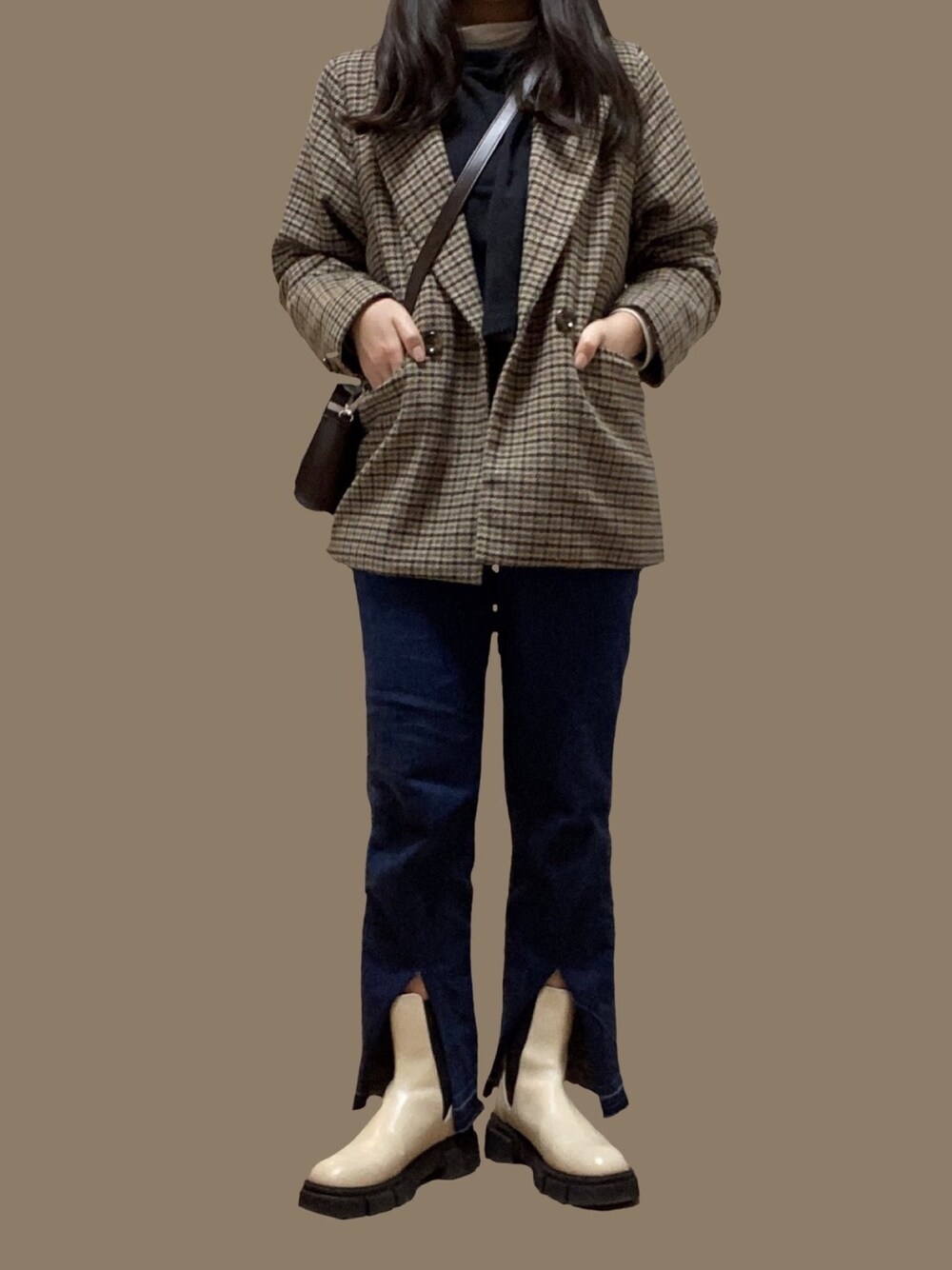 Naのテーラードジャケット「チェック柄ダブルコート ジャケット ビッグシルエット」を使ったコーディネート