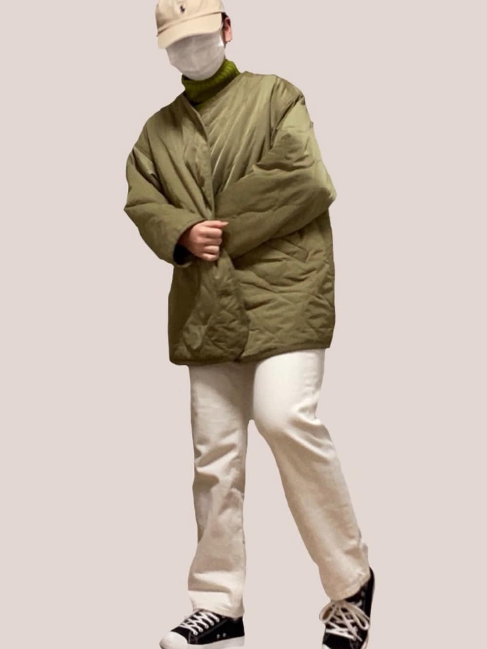 Naのノーカラージャケット「《JaVaジャバ コラボ》大人のこなれ感。 ノーカラー オーバーサイズ キルティング コート」を使ったコーディネート
