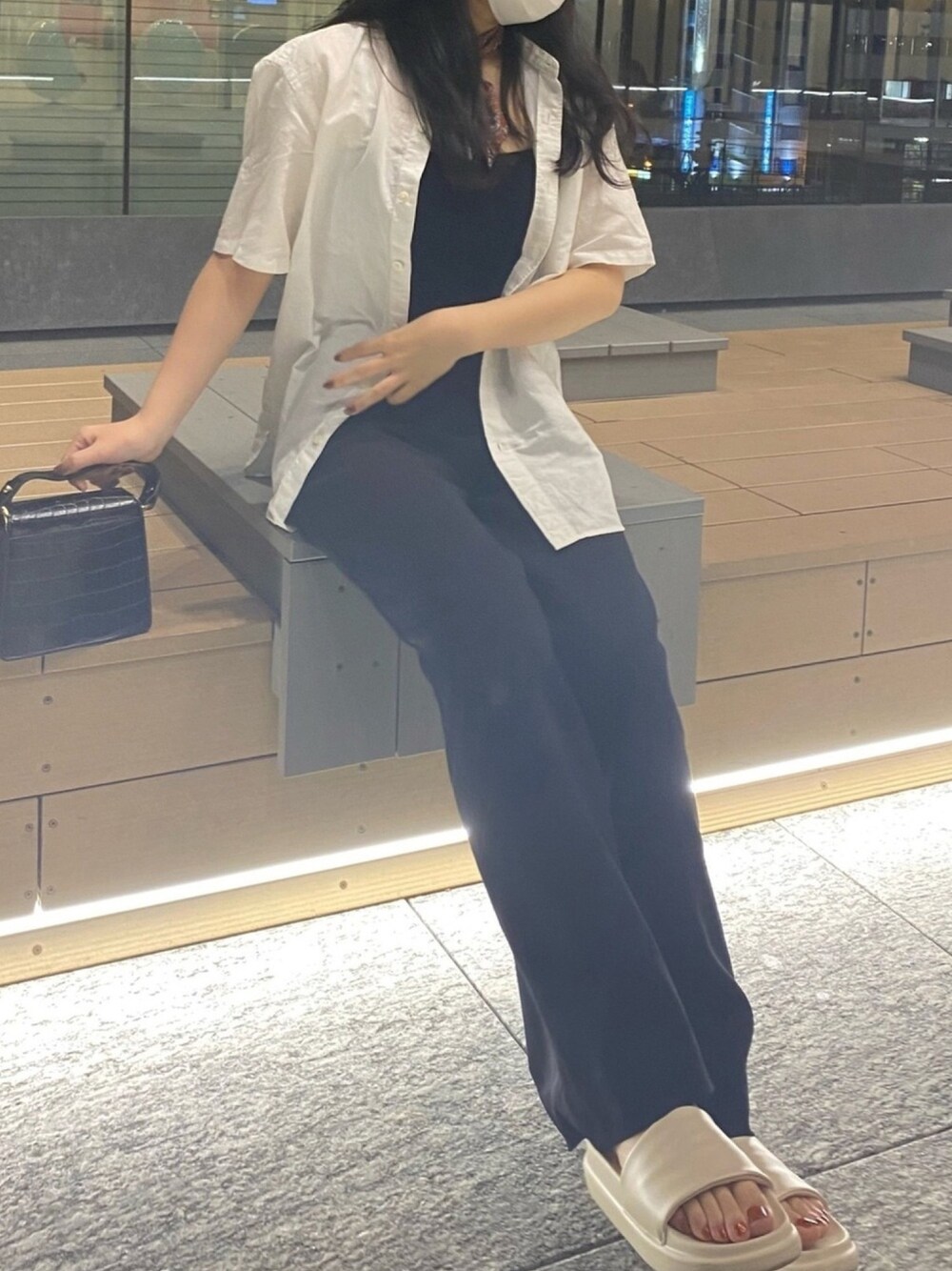 ホワイト系のシャツ/ブラウス、ベージュ系のサンダルを着用したレディースの夏コーディネートの1枚目の写真