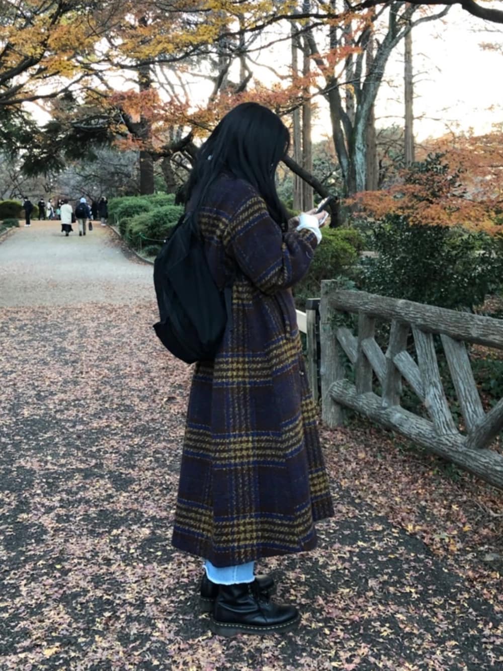 Naのステンカラーコート「チェック柄タックロングコート」を使ったコーディネート
