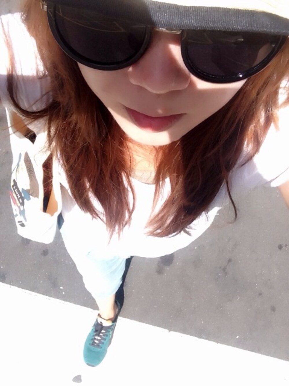 グリーン系のスニーカーを着用したレディースの夏コーディネートの1枚目の写真