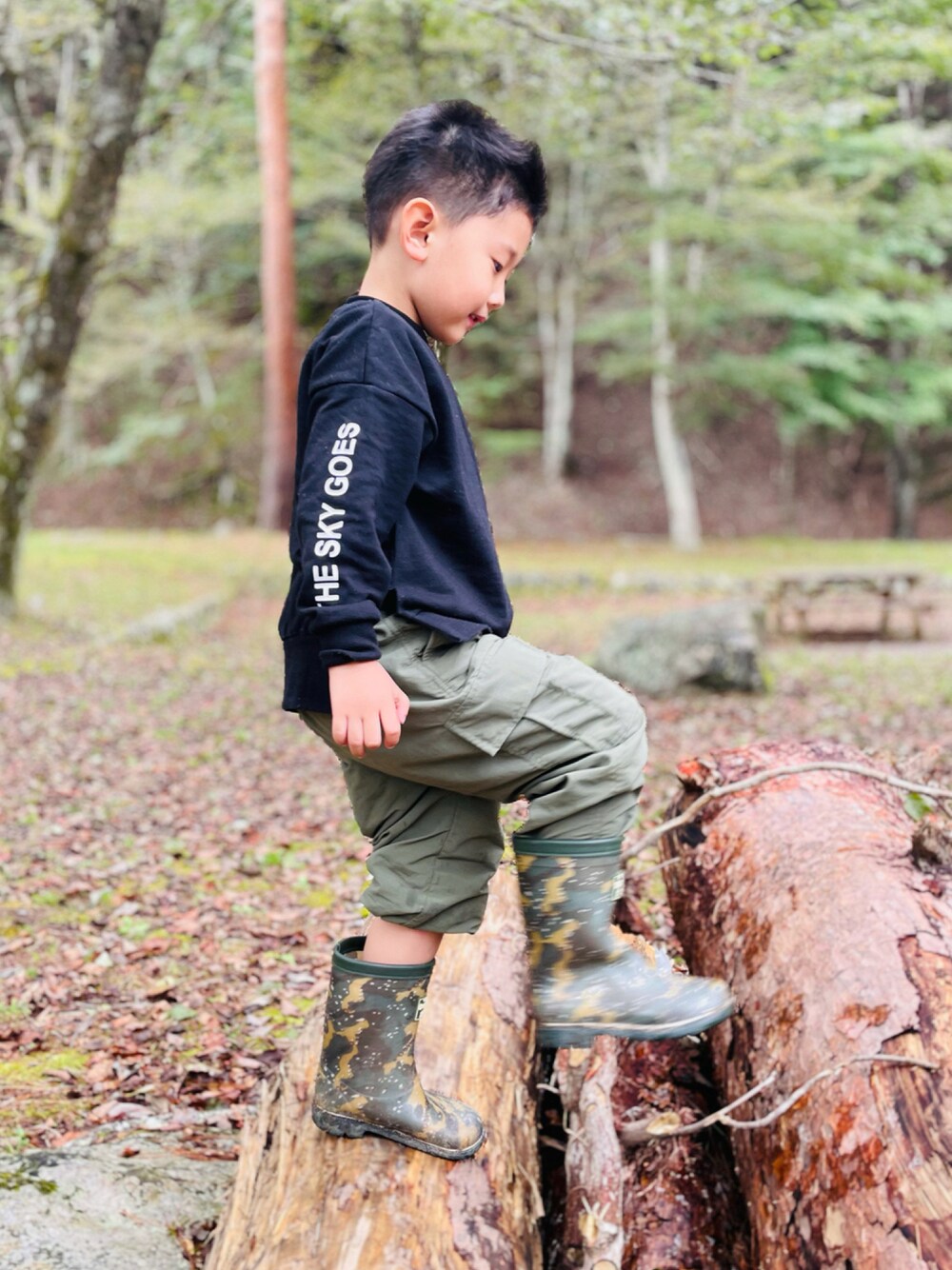 キャンプコーデ2日目 雨が朝降ってたのでレインブーツで探検に♡