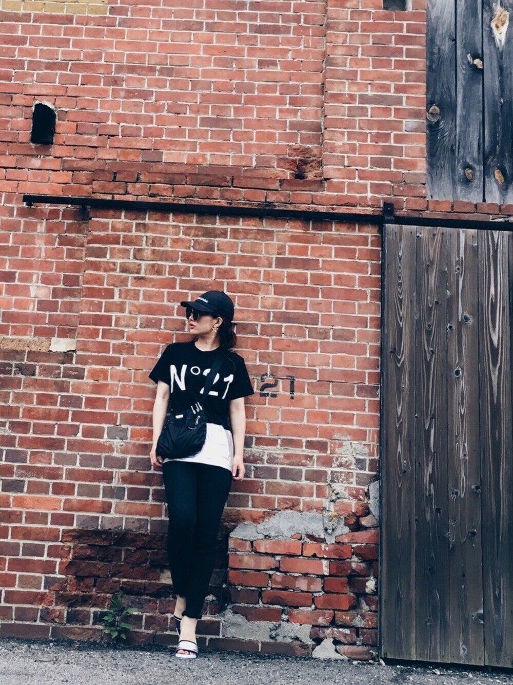 N°21のシルバー箔プリントT プチプラだけどめっちゃかわいい fancy by sayuさんセレクトの シルバーサンダルと😍✌️ ブラックコーデな日 ナンバーヌメロな お気に入りの背景で💓