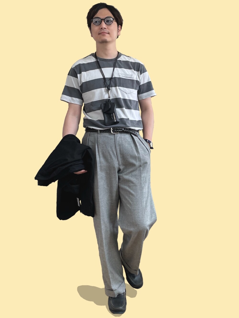 ▼着用品 キャップ:BrooksBrothers Tシャツ:Schott シャツ:sh レザーポーチ:delife ベルト:WhitehouseCox スラックス:PoloRalphLauren ローファー:paraboot ▼コーディネートについて コントラストを強くしすぎないモノトーンスタイルです。 強調したいものがある場合にはハッキリとした黒と白でのモノトーンは有効ですが、今回は渾然とした全体感を大切にしたかったので、あまりハッキリとした黒と白は避けました。 もし今回の服装でレザーポーチやシャツを目立たせたい場合にはインナーは白Tが良かったでしょうし、靴を目立たせたい場合は白デニムなんかが良かったと思います。 つまり「今日はこれを着たい!」というものが明確にある場合には明暗差を利用するとコーディネートが決まりやすいです。 逆に今日の僕のように渾然とした雰囲気が気分の場合には、コントラストは弱めのものを組み合わせると良いと思います。