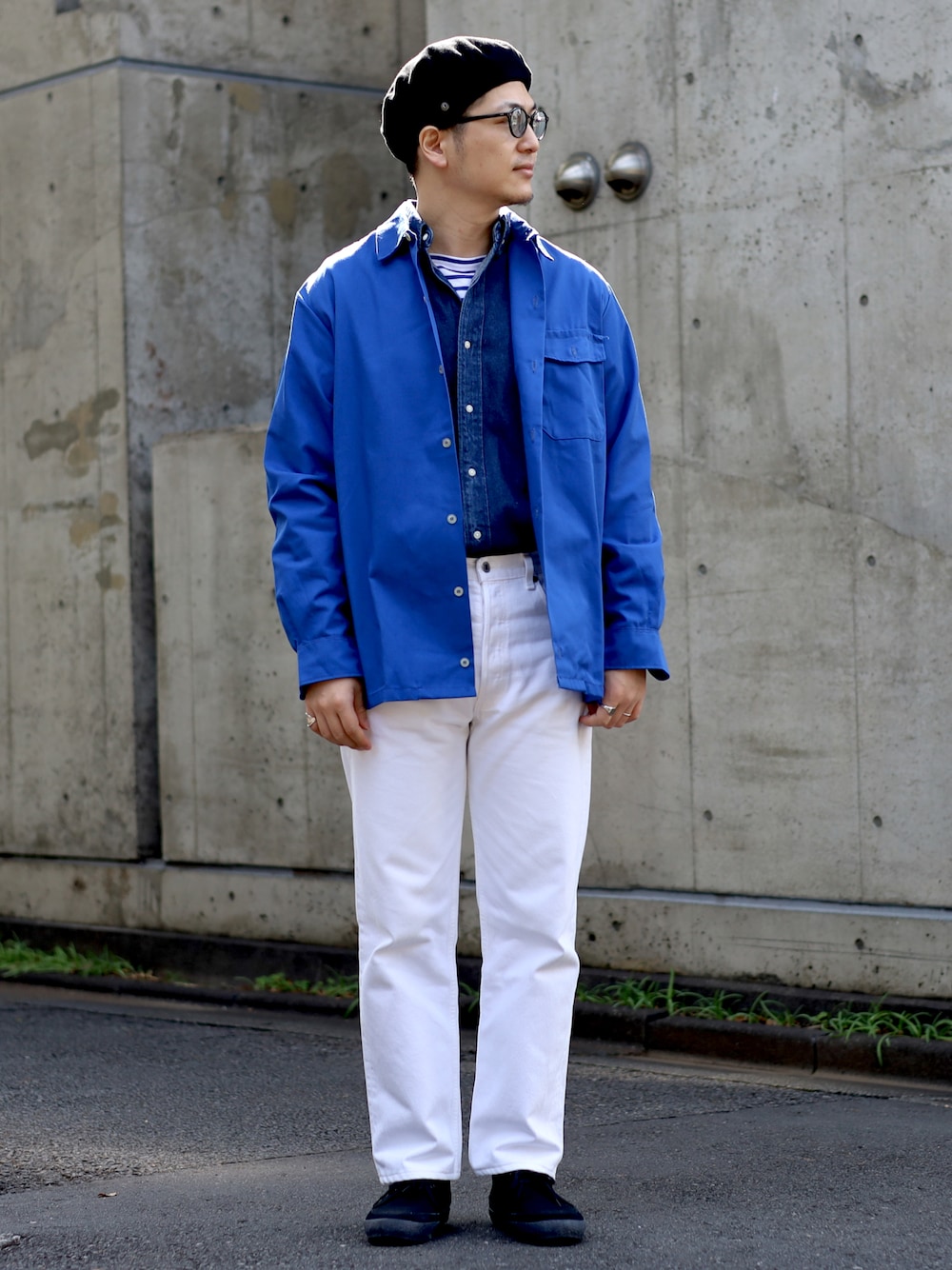 フレンチワークジャケットを使ったスタイリングです。 インナーのボーダーと、ベルトレスで軽さを出したのがポイントです。