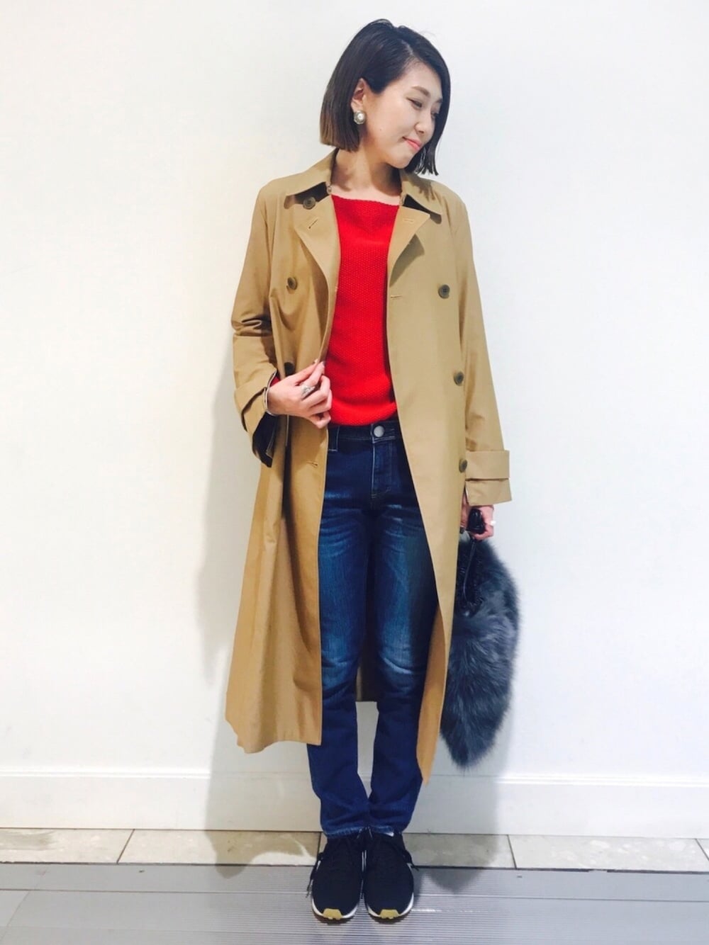 いつもいいね❤️、セーブありがとうございます😊 ついにCEPIE.のトレンチコートをゲットしました! レッドのニットを差し色に❤️ 今週寒くなりそうなので大活躍しそうな予感、、、😍