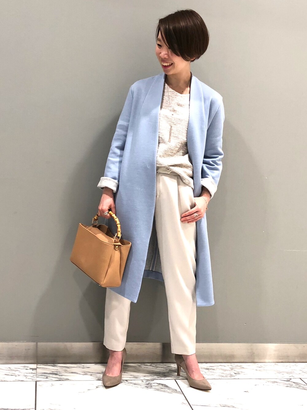 ご覧頂きありがとうございます♪♪ 本日はキレイめパンツスタイルです‼︎ 爽やかなブルーのアウターをメインに、中はワントーンでまとめました☆