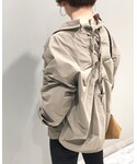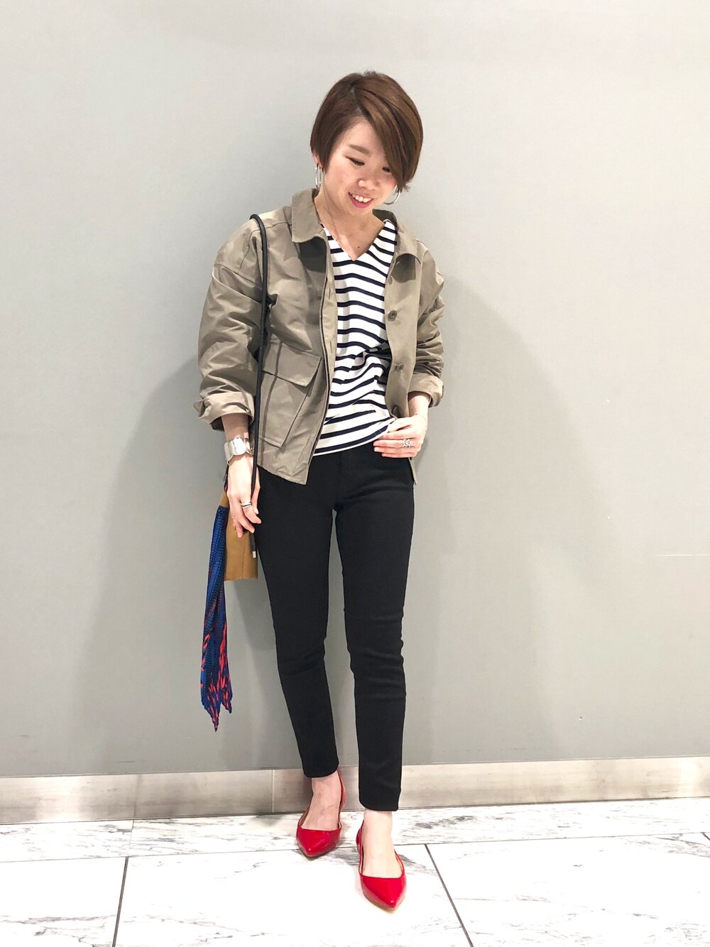 ご覧頂きありがとうございます♪♪ 最近ロング丈のアウターが続いていたので、今回はミリタリーのショート丈をチョイスしました☆ 後ろがレースアップになっています‼︎ 赤のパンプスをポイントに…♡