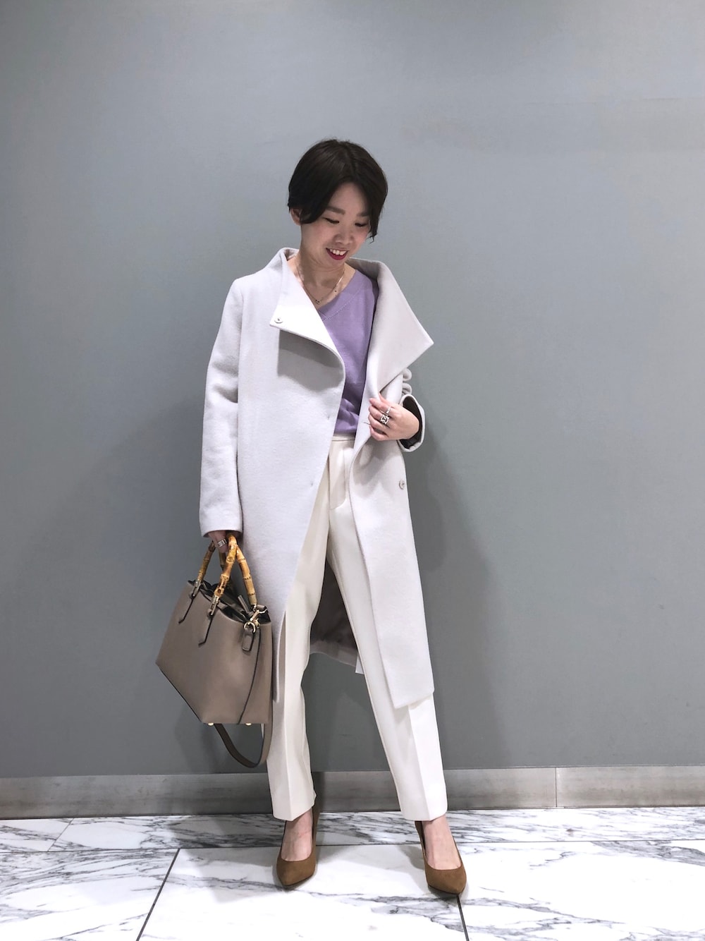 ご覧頂きありがとうございます♪♪ 綺麗めパンツスタイルです‼︎ ボタンを閉めて着るとボトルネックになるコートです‼︎ 冬も明るいカラーで華やかに…♡