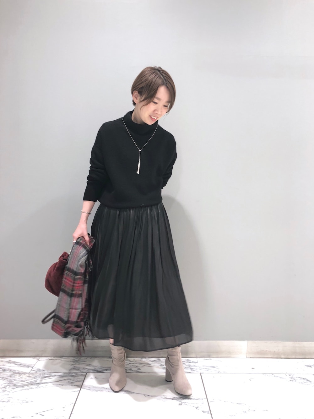 ご覧頂きありがとうございます♪♪ めずらしく、全身ブラックコーデがしたくなったので、本日はブラックコーデです(^ ^) 光沢のあるスカートは、全身ブラックでも重い印象にならないのが嬉しい♡