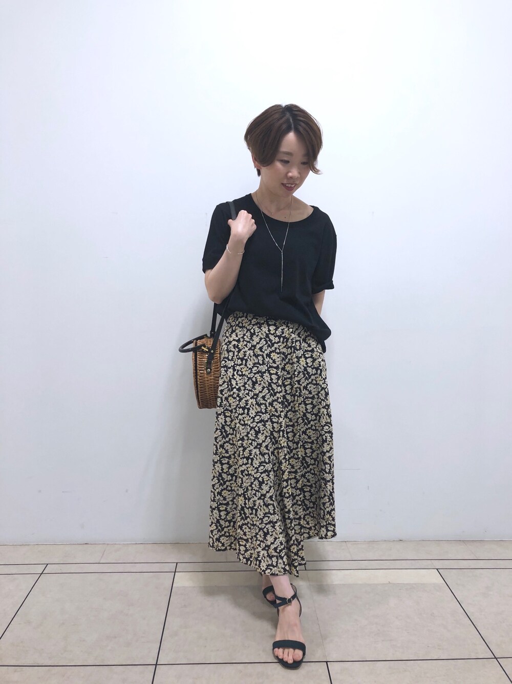 ご覧頂きありがとうございます♪♪ G.Wのお出かけに着ていきたい‼︎スカートコーディネートです♪♪ ヴィンテージ感のある花柄なので、甘くなり過ぎず、着て頂けます‼︎ アシンメトリーな感じも素敵です♡ Tシャツは後ろのさりげないロゴがポイントです‼︎