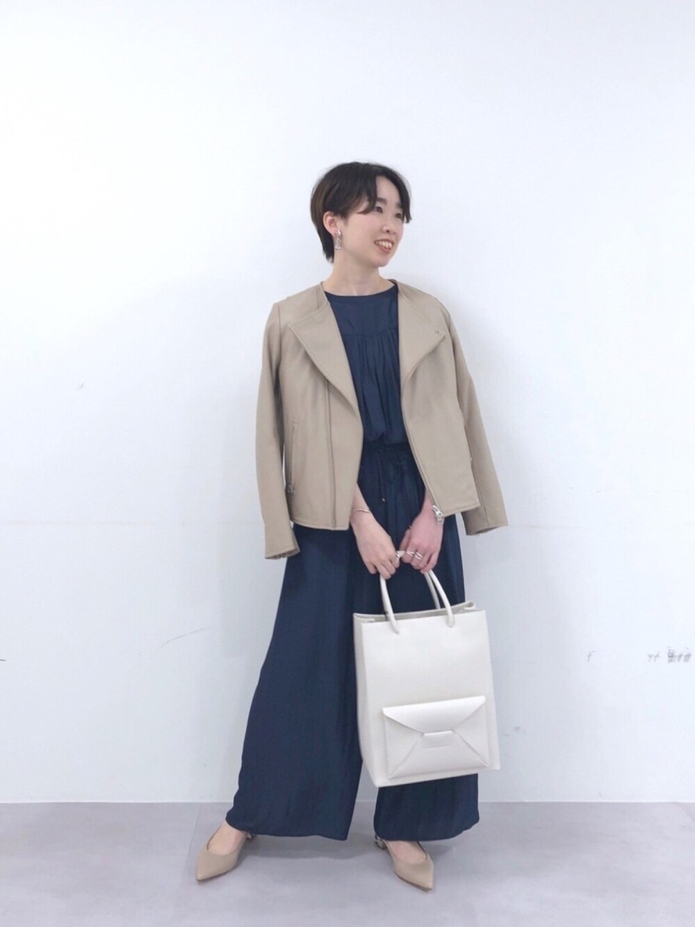 ☺︎いこまい☺︎(RIVE DROITE 名古屋PARCO)のライダースジャケット「女性らしい柔らかな雰囲気を与えてくれる ノーカラーライダースジャケット」を使ったコーディネート