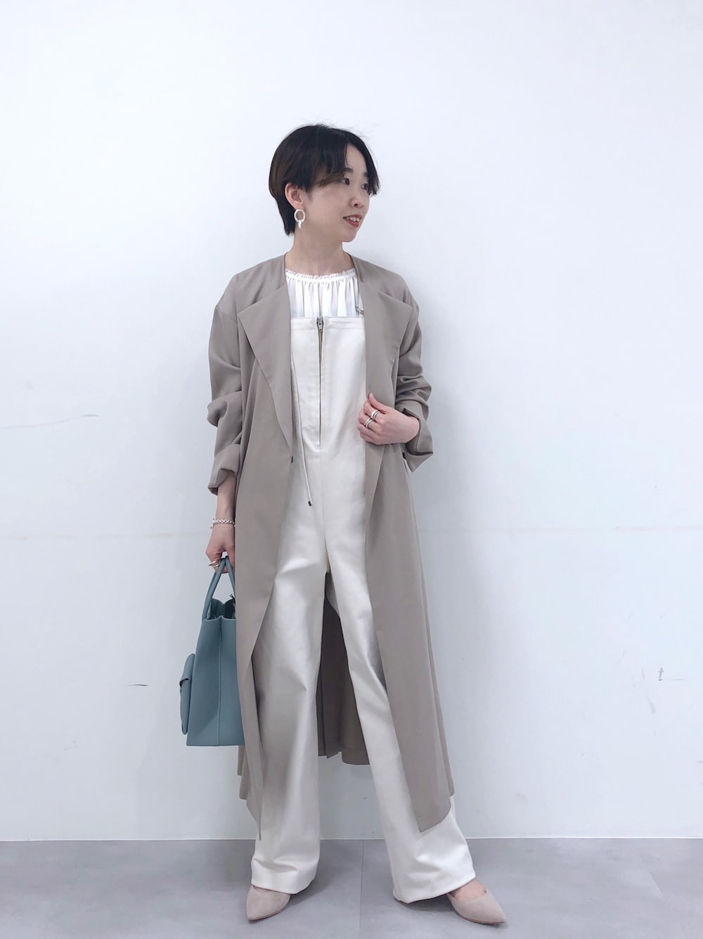 ご覧頂きありがとうございます♪ ホワイト×ベージュの柔らかいカラーでまとめて、大人のサロペットコーディネートに…‼︎