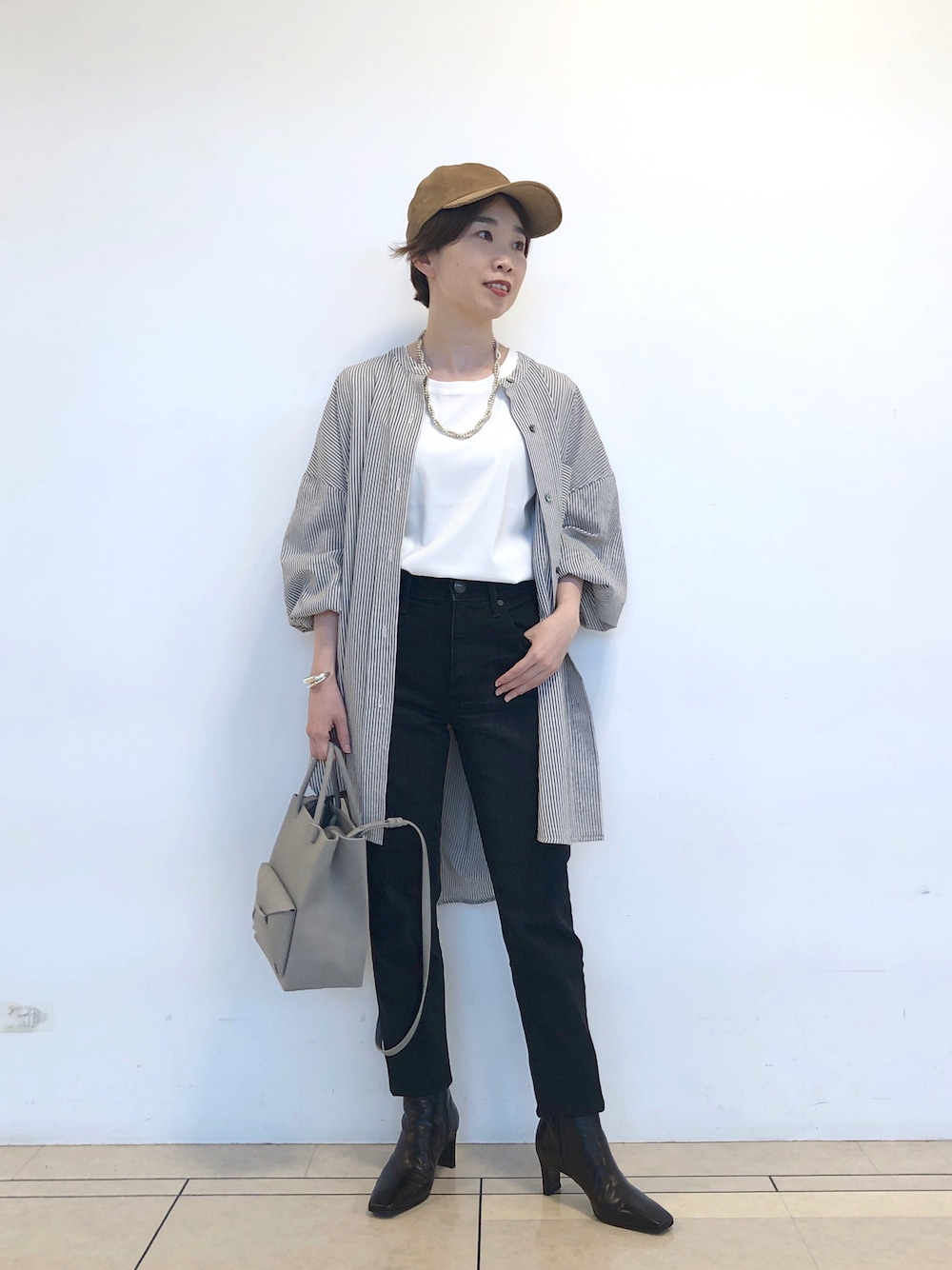 ご覧いただきありがとうございます♪ シャツ×デニムのシンプルなコーディネートです。 お袖のボリュームと後ろのギャザーの感じが可愛いです!