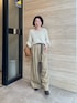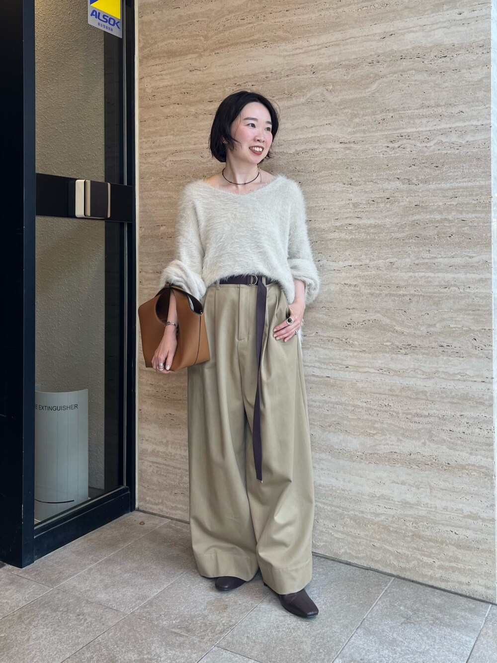 メランジフェザー2WAYニットは、ふわふわで柔らかい素材感で着るだけで着映えするニットです。ウールが入っていないので、チクチク感もなくお召しいただけます。 ベージュ系のワントーンのコーディネートに、小物はブラウンでまとめました。
