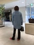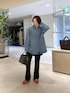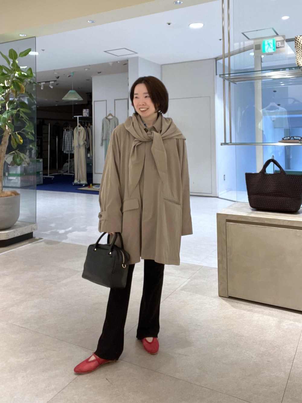 裾にかけて広がるデザインのテントシルエットのステンカラーコート。 ボトムはスッキリとしたシルエットのパンツを合わせました。