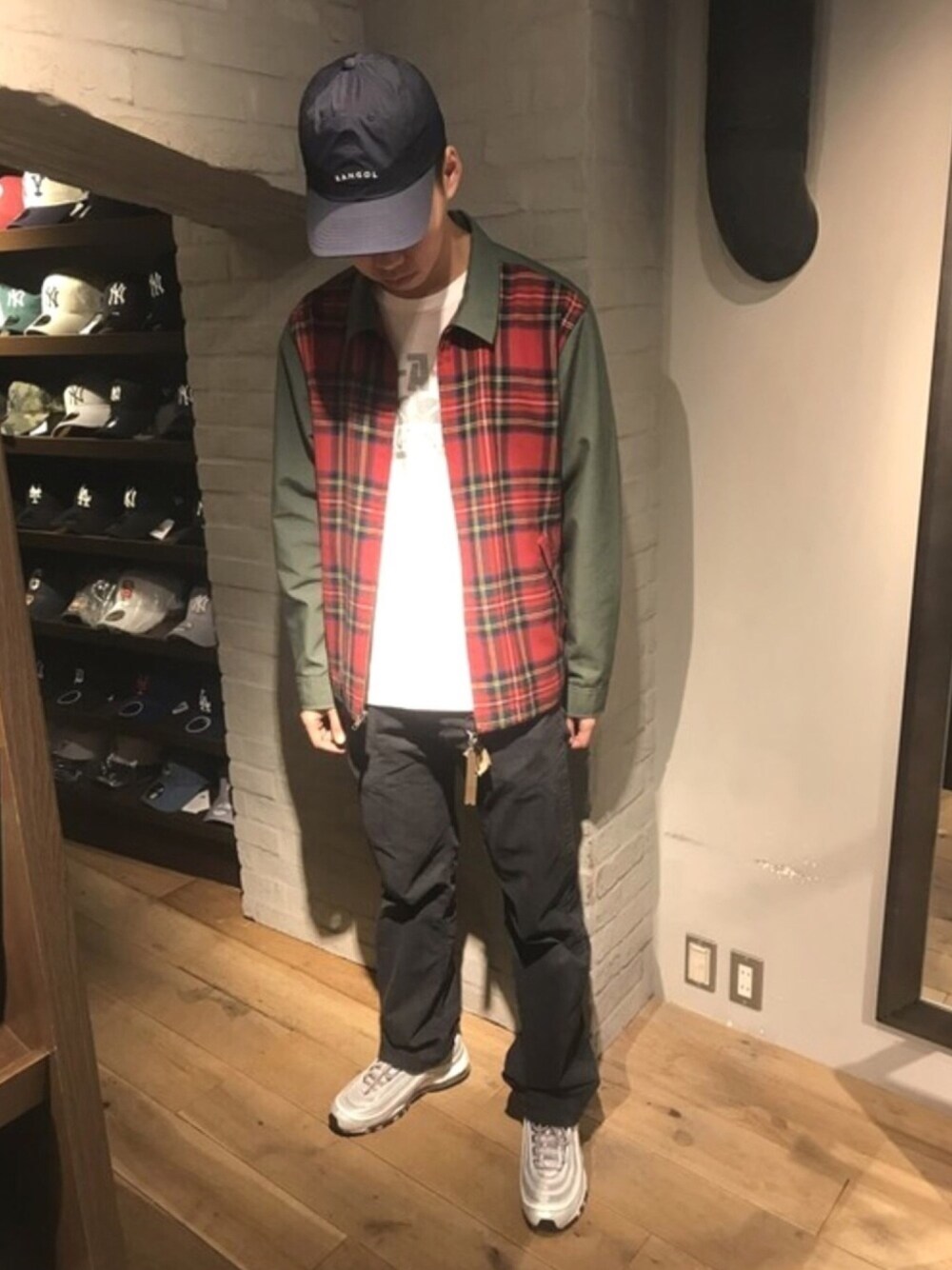 春らしく色合わせに気を使った、シュプリームをメインとしたコーディネートです! 今どきというよりは全体的に落ち着いたテイストだったので、カンゴールをチョイスしました。カラーで悩みましたが、カーキで合わせるとミリタリーっぽくなってしまうかなと思ったので、ネイビーのパンツに合わせました。 ベージュやブラックでも良かったかなと思います!オススメです!