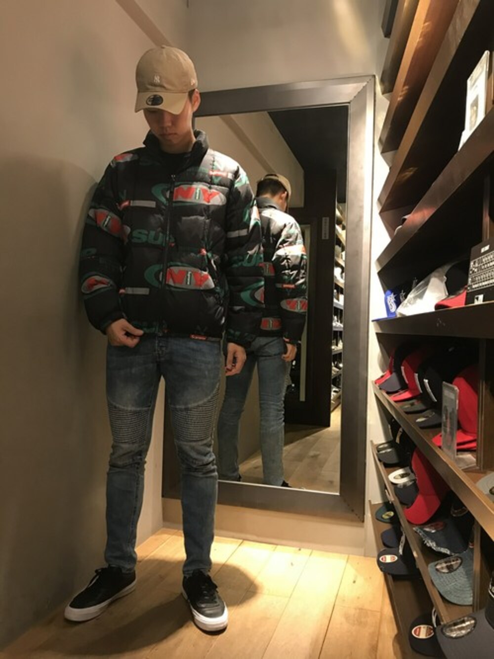 ダウンジャケットを使った、全体的に細めなストリートスタイルです。 supremeのダウンが難しい色合いだったので、インナーと靴を黒に統一してまとめました。 キャップは、アクセントを入れつつも、うまく合わせたかったので、シンプルで合わせやすいベージュを選びました。アトランタブレ―ブスや、カンゴールのキャップで合わせても良かったかと思います。 ベージュのNYのキャップは、オールシーズン活躍できそうなアイテムなので、ひとつ持っていると重宝します!