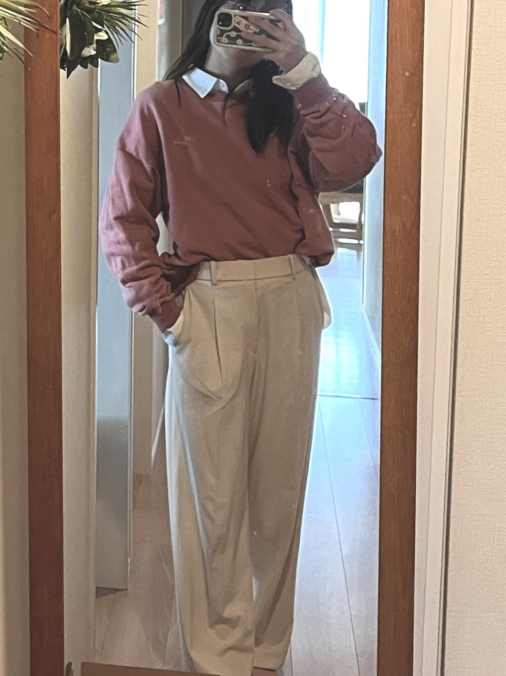 シャツとスウェットとタックワイドパンツを合わせたコーデだよ